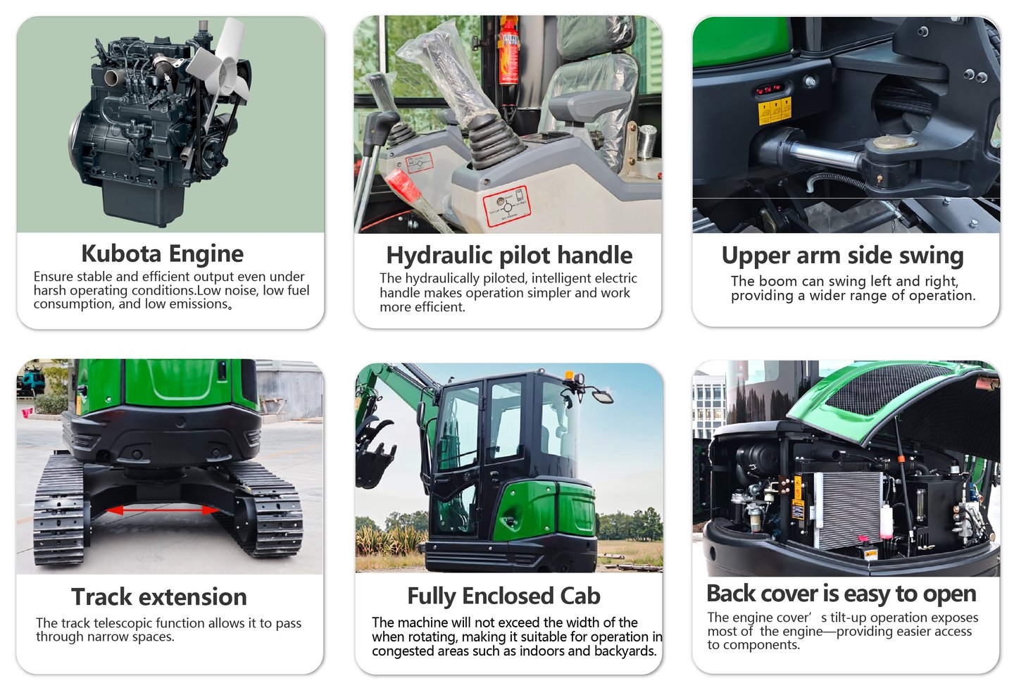 Comfortable seats, ergonomic joysticks, and centralized maintenance points ensure operator comfort during long working hours and significantly reduce maintenance costs.